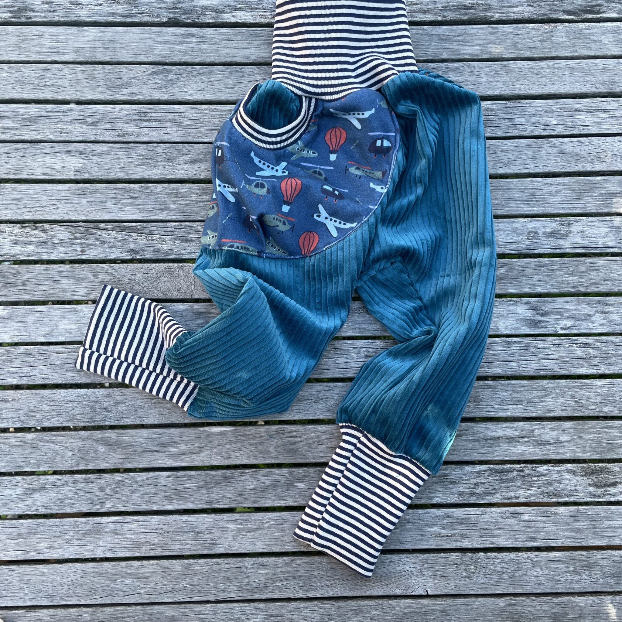Die „Räuberhose“ aus Breitcord in der Farbe petrol ist ausgestattet mit großer Flieger-Sammeltasche. Da passen alle Räuberschätze hinein und können mit auf die Räuberreise gehen. Und als Besonderheit ist die Räuberhose mit einem Aufhänger versehen, so dass sie wenn nötig an den Haken kommt 😉