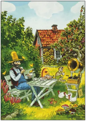 Postkarte Pettersson und Findus Pfannkuchen-Garten-Party